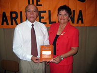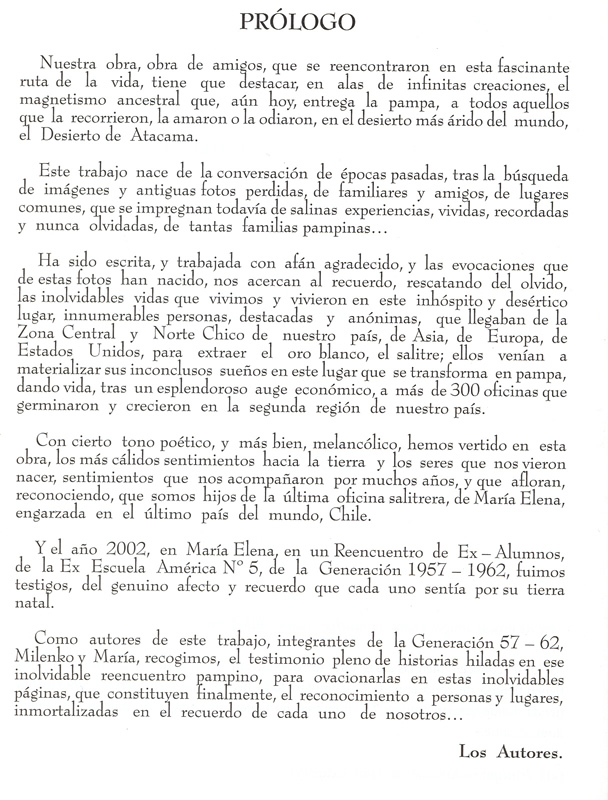 Fecha 13 Diciembre 2004 En una masiva manifestación pampina, colmada de bellos recuerdos y amigos de toda la vida, ayer se lanzó oficialmente el libro “Ausencias y Almas Pampinas”, escrito por María Cortés Astorga y Milenko del Valle Sibilia, dos pampinos de tomo y lomo nacidos en la Oficina Salitrera María Elena. La ceremonia fue presidida por el alcalde de la comuna pampina, Santiago Lambert Escobar, quien hizo posible la edición de esta nueva obra literaria, donde la nostalgia de los años felices aflora en cada página a través de narraciones poéticas e impecables fotografías de la época, reflejando las vivencias que marcaron la vida de ambos autores. Fue una emocionante velada que se vio realzada con la presencia del escritor Hernán Rivera Letelier, quien felicitó a los creadores y a la directiva del Centro Hijos y Amigos de María Elena, por mantener en alto el espíritu salitrero, y los instó a seguir en esa senda. También estuvo presente el poeta Nelson Codocedo Gallardo, quien les dedicó un nostálgico poema. El acto oficial comenzó con la bienvenida a cargo de Nelson Herrera Farfán, presidente del Centro Hijos y Amigos de María Elena, quien dio paso al destacado locutor Jaime Guerra, quien actuó de maestro de ceremonia, dando con su notable voz, la solemnidad del caso. Milenko del Valle señaló a La Estrella que su libro “es una obra de amigos que se reencontraron en esta fascinante ruta de la vida, tiene que destacar, en alas de infinitas creaciones, el magnetismo ancestral que, aún hoy, entrega la pampa, a todos aquellos que la recorrieron, la amaron o la odiaron, en el desierto más árido del mundo, el Desierto de Atacama”. Por su parte, María Cortés manifestó que “con cierto tono poético, y más bien, melancólico, hemos vertido en esta obra, los más cálidos sentimientos hacia la tierra y los seres que nos vieron nacer, sentimientos que nos acompañaron por muchos años, y que afloran, reconociendo, que somos hijos de la última oficina salitrera, de María Elena”. En la oportunidad, también se rindió un emotivo homenaje a la profesora Silvia González de Marín, quien junto a su esposo Hugo Marín, viajaron especialmente desde su residencia para asistir a la ceremonia. Ella fue profesora de los autores del libro, quienes gracias a un reencuentro después de 40 años de egresar de la enseñanza básica de la Escuela América Nº 5, se decidieron a concretar el libro que hoy ve la luz y está disponible para toda la comunidad y, especialmente para los eleninos. Tras la ceremonia oficial se ofreció un rico almuerzo y se continuó con un animado baile, como en los viejos tiempos del Salón de Baile, del Rancho Nº 6 o de las fiestas caseras. |